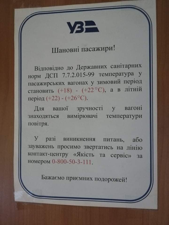 «З 1 травня по 30 вересня діють «літні» норми температури у вагонах, при цьому повинні бути в справному стані система вентиляції та кондиціонування повітря у вагонах. За дві поїздки у вагоні класу «люкс» (СВ) поїзда 69/70 Львів – Маріуполь 01.05.2021 і 10.05.2021 жодного разу не працював кондиціонер. Точніше, в першій поїздці його запустили, але пропрацював він недовго, тому що він не був підготовлений певним чином до перевезень. Провідник вагона № 4 та електромеханік дійсно всіляко намагалися налагодити його роботу, але марно. Провідниця при цьому просила вибачення.