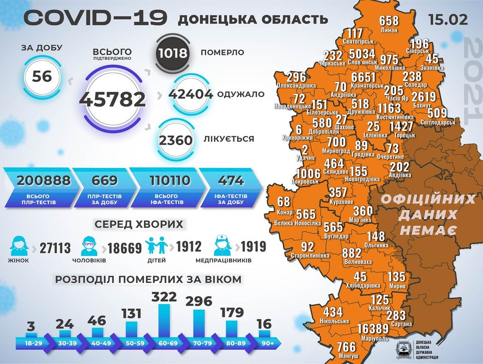 Зазначимо, за весь час пандемії в Донецькій області зареєстровано 45 782 хворих на коронаіврус. З них 42 404 чоловік одужали, а 1 018 померли. Продовжують хворіти 2 360 пацієнтів.