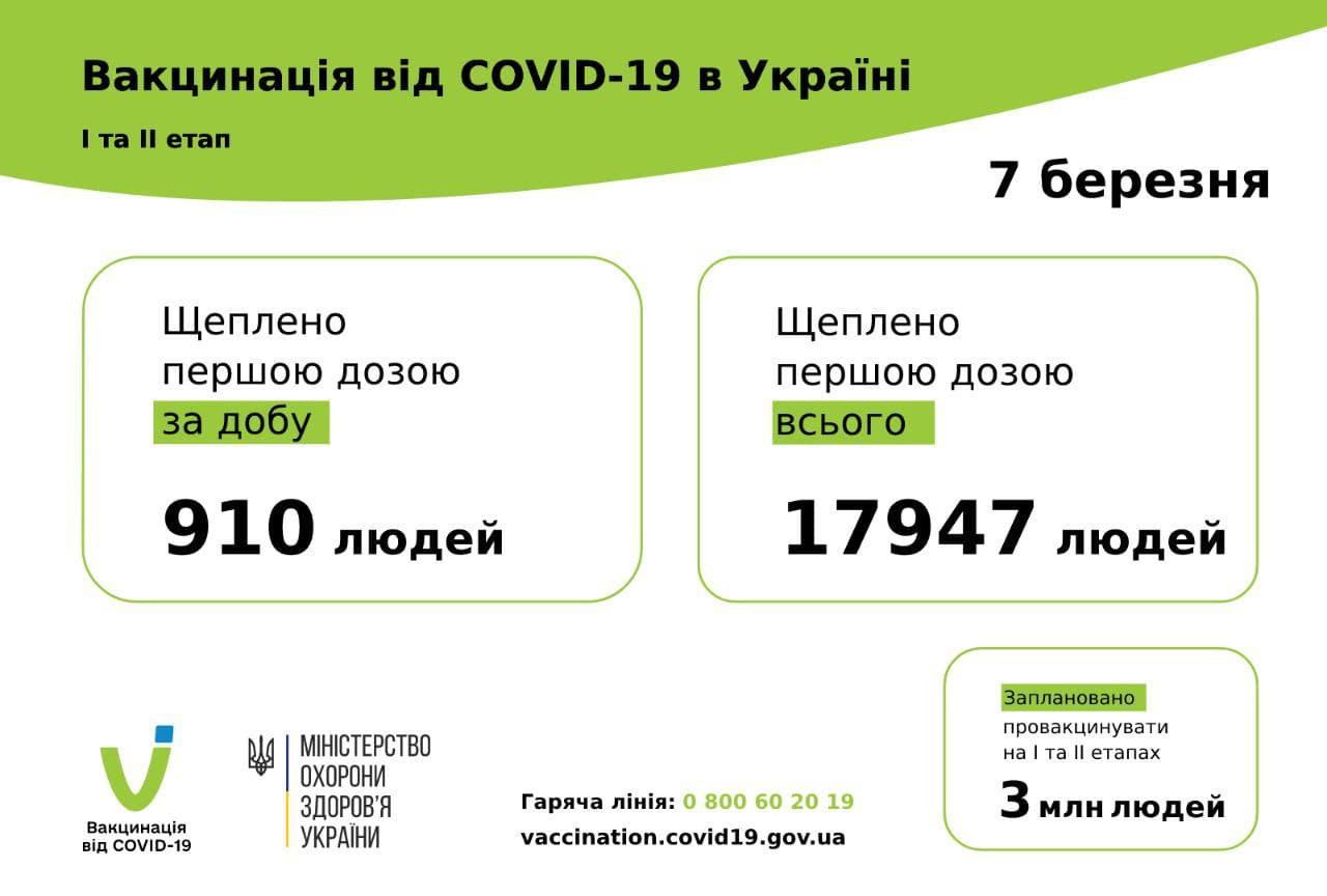 Крім того, за минулу добу в Україні було проведено 910 щеплень від коронавірусу. За весь час вакцинації в країні першу ін'єкцію отримали 17 947 осіб.