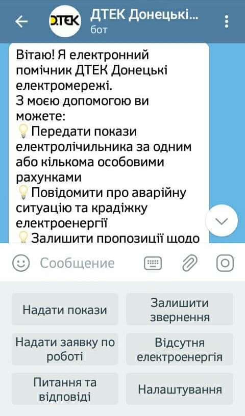 «На старті роботи чат-бот ДТЕК Донецькі електромережі працюватиме у месенджерах Viber та Telegram. На наступних етапах впровадження його перевагами можна буде скористатися також у Facebook», — додають у ДТЕК.