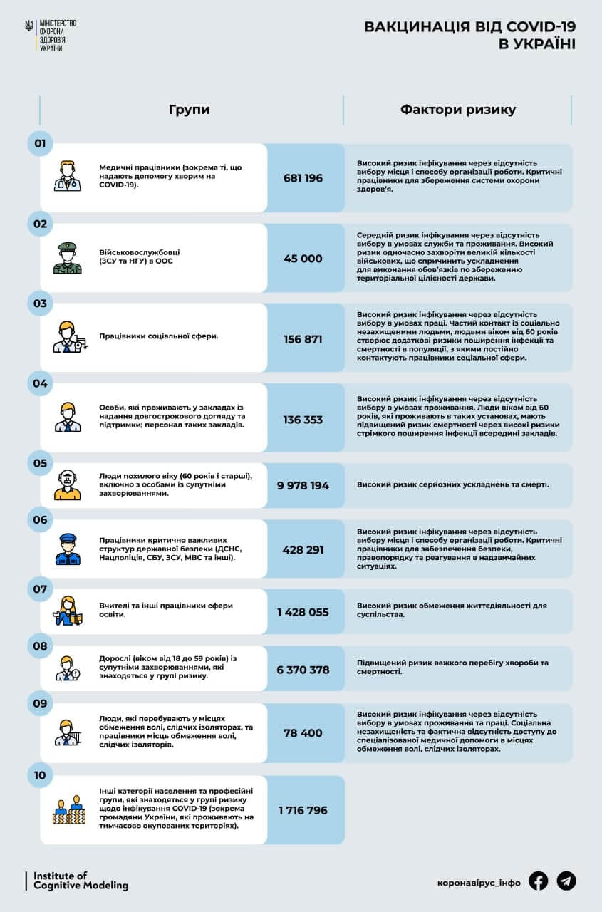 План Міністерства охорони здоров'я з вакцинації українців передбачає п'ять етапів. На першому етапі щеплення отримає близько 367 тисяч українців, в першу чергу ті професійні групи населення, чия робота критично важлива в умовах пандемії, і найбільш схильні до ризику зараження категорії населення. На другому, третьому і четвертому етапі МОЗ вакцинує відповідно 3, 7 і 11 мільйонів, на п'ятому, останньому етапі – все інше доросле населення України.
