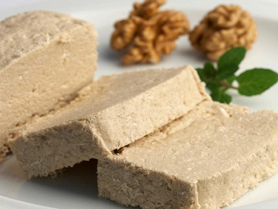 З цукру, лимона, апельсина, кориці і води зварити сироп. Довести до кипіння і варити хвилин 15 до загустіння. У сковороді розігріти оливкову олію. Всипати манку і добре перемішати. Обсмажити все разом. Потроху влити сироп, помішуючи. Додати подрібнені волоські горіхи. Викласти у форму, добре утрамбовуючи. Охолоджувати декілька годин і подавати до столу.