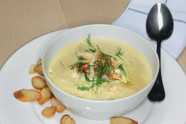 Отриманий бульйон змішати з вершками і варити ще п'ять хвилин. Шийки раків залити соком лимона і перемішати з крупно нарубаним кропом. У тарілку покласти трохи ракового м'яса з кропом і залити крем-супом. Соль не додається. Суп повинен мати солодкуватий морквяно-кропово-раковий смак.
