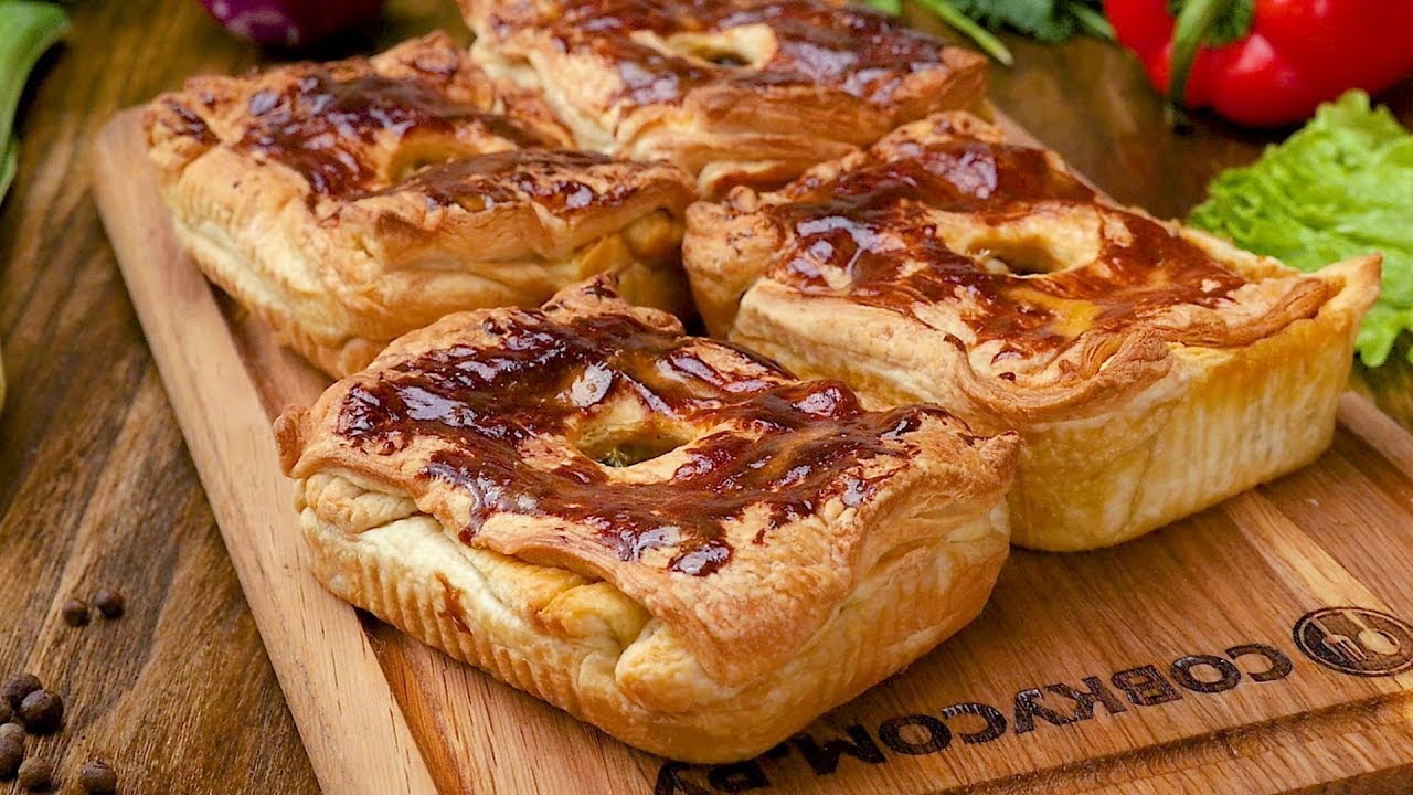 Потім розкатати тісто у великий тонкий пласт квадратної форми, викласти його на лист для запікання, щоб кути звисали з боків. Звести кути тіста до центру, намічаючи кордони для фаршу. Змішати фарш з гарбузом і викласти начинку на тісто, не виходячи за намічені лінії згину. Шар начинки повинен бути досить товстим – близько 1,5 см. Начинку за бажанням можна не змішувати, а укласти шарами – м'ясо, гарбуз. Накрити начинку звисаючими краями тесту, звівши кути до центру конвертом.