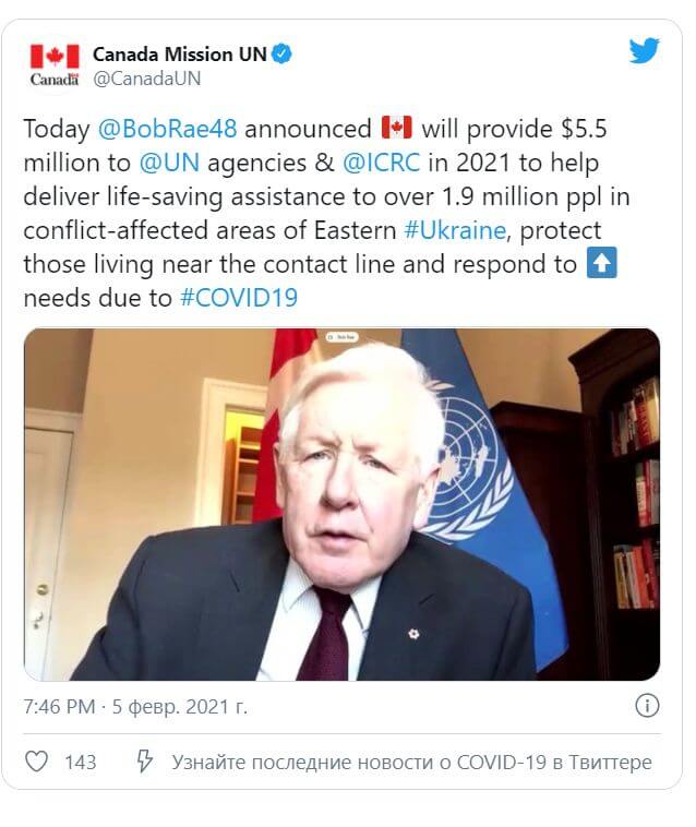 «У 2021 році Канада передасть агентствам ООН і МКЧХ 5,5 млн канадських доларів для надання допомоги в порятунку життів більш ніж 1,9 млн людей в регіонах Східної України, постраждалих від конфлікту, захисту людей, що живуть поблизу лінії зіткнення, а також реагування на зростаючі потреби, пов'язані з COVID-19», - заявили в дипломатичному посольстві.