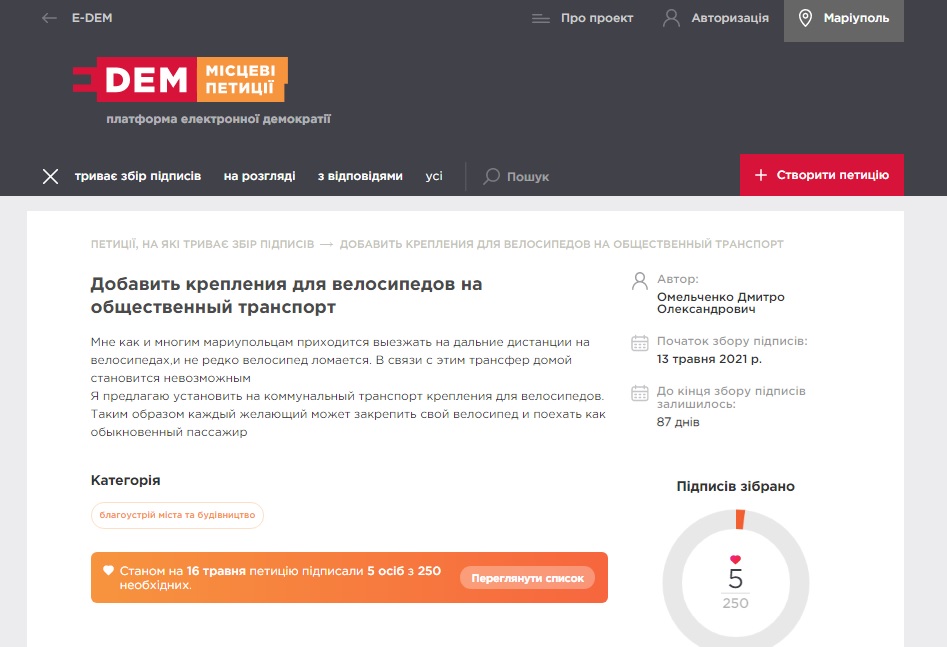Петиція була створена 13 травня і зібрала п'ять підписів. Нагадаємо, що для розгляду пропозицій городян муніципалітетом необхідно зібрати 250 підписів.