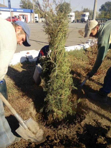 Роботи з озеленення розпочалися на території школи №17, де металурги висадили 15 молодих туй, потім – саджанці ялин колючих на перехресті вулиці Гугеля з вулицею набережною та на території Маріупольського професійного ліцею будівництва.