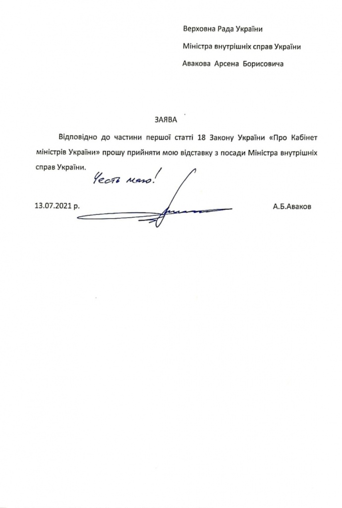 «Відповідно до частини першої статті 18 Закону України« Про Кабінет міністрів України» подав заяву про відставку з посади Міністра внутрішніх справ. Дякую команді МВС за роки спільної праці. Дякую кожному офіцеру, рядовому і службовцю. Маю честь», - написав Аваков в заяві.