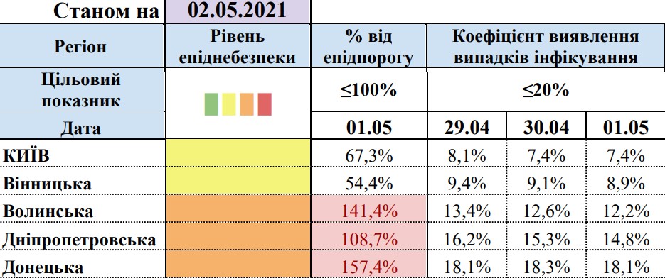 За даними міністерства, епідемічна ситуація в Донецькій області на 2 травня найгірша в Україні – 157,4% від епідпорогу. Критичними залишаються показники рівня госпіталізації: на 1 травня це 65,7 особи на 100 тисяч населення при нормі в 60.