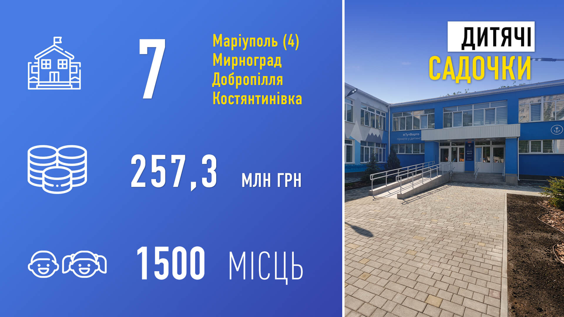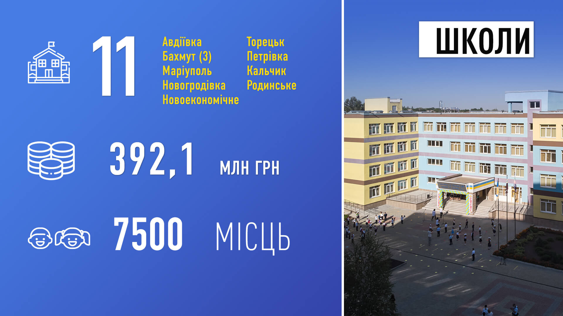 Також в рамках цьогорічного «Великого будівництва» покращать умови навчання для 7,5 тисяч учнів області: роботи проведуть у школах Авдіївки, Лиману, Маріуполя, Новогродівки, Родинського, Торецька, смт Новоекономічне та у селищах Кальчик і Петрівка. Крім того, в Маріуполі добудують чотири дитсадочка. На заклади освіти Донеччини по президентській програмі виділять 257,3 млн грн.