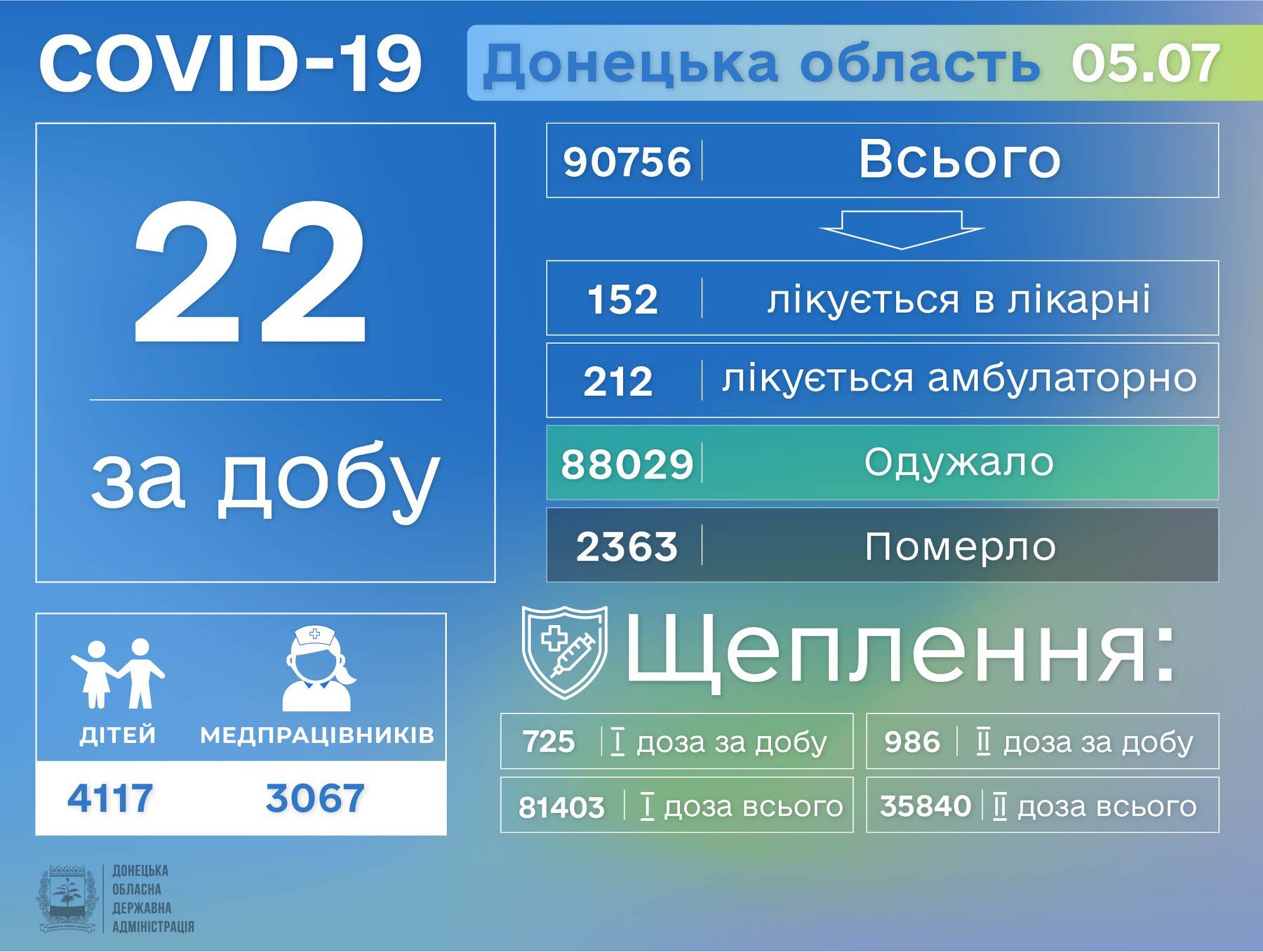 За минулу добу, 5 липня, в Донецькій області зафіксували 22 хворих на коронавірусну інфекцію.