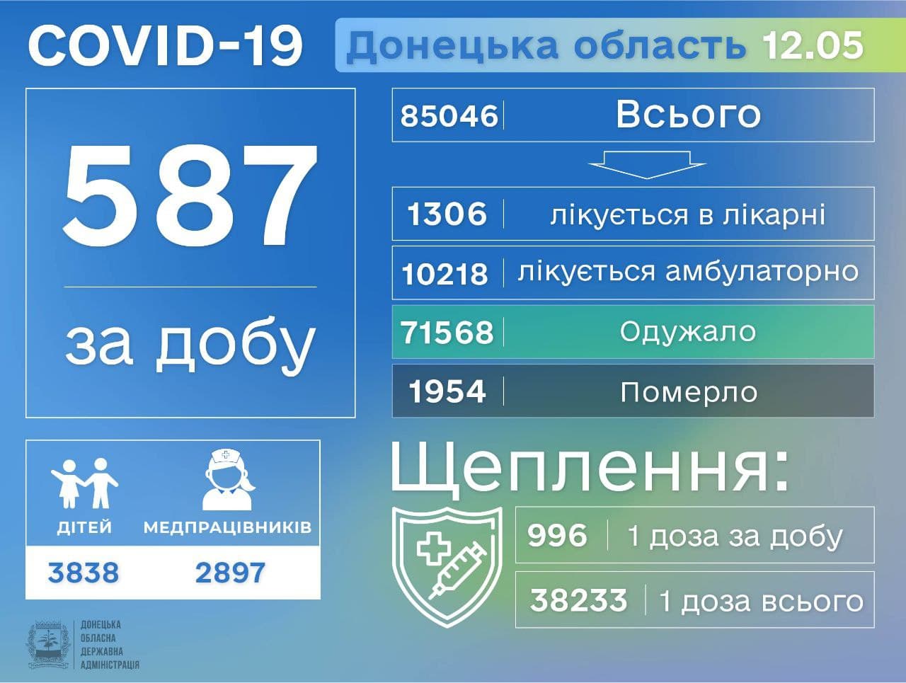 За весь час пандемії на Донеччині підтверджено COVID-19 у 85 046 осіб. Лікується амбулаторно - 10 218 осіб, у лікарні - 1306.