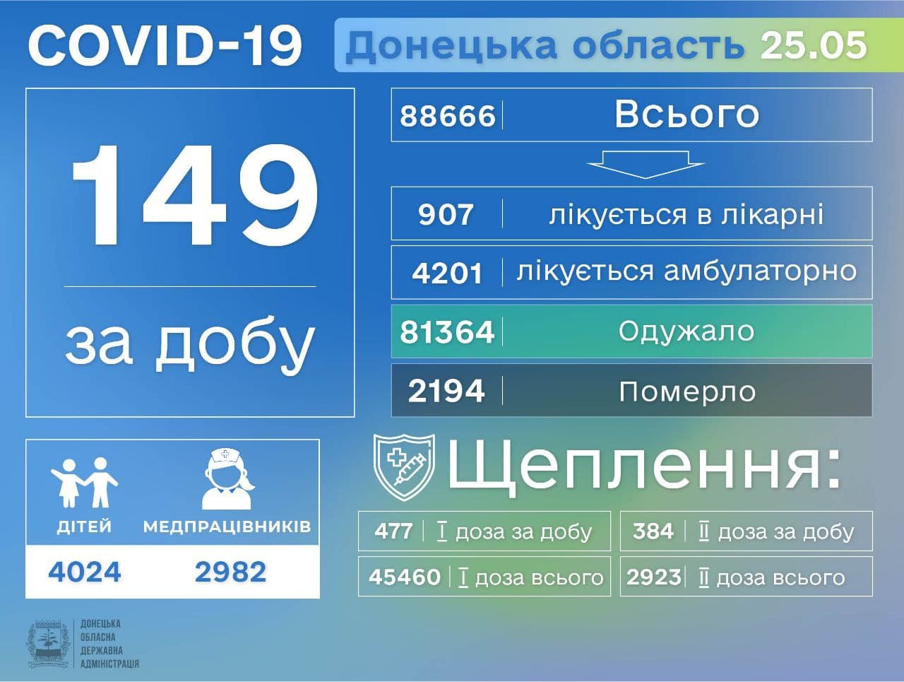 За весь час пандемії на Донеччині підтверджено COVID-19 у 88 666 людей. Лікується амбулаторно - 4201 осіб, у лікарні - 907 пацієнтів.