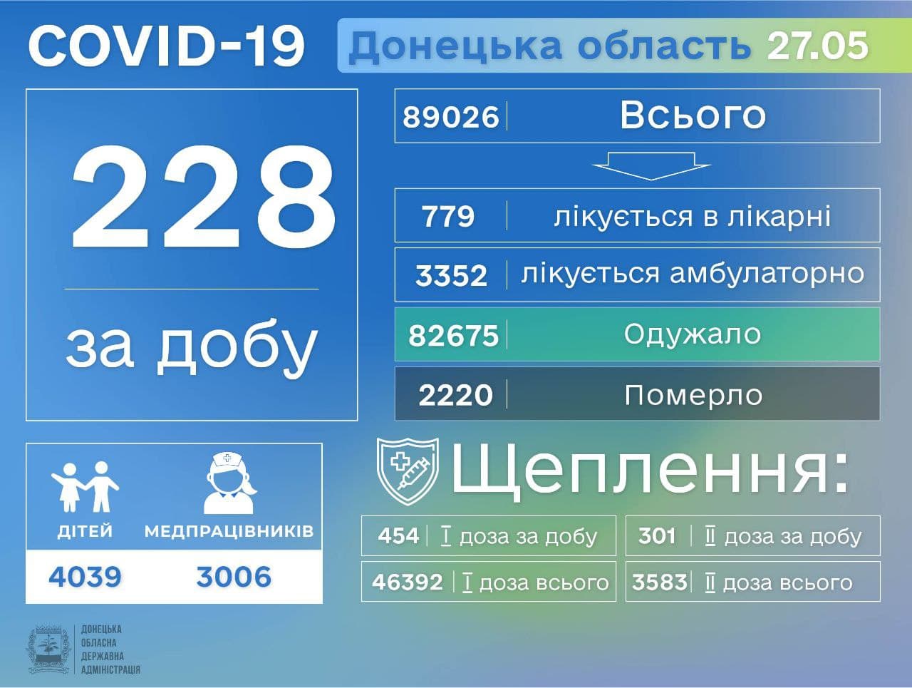 За весь час пандемії на Донеччині підтверджено COVID-19 у 89 026 осіб. Лікується амбулаторно - 3352 особи, у лікарні - 779 пацієнтів.