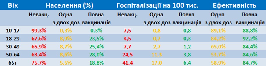 Як бачимо, найбільший ризик потрапити до "ковідних" відділень мають українці старшого віку, що відмовилися від щеплення. Саме ця вікова група наразі найменше охоплена вакцинацією. При цьому, навіть перша доза вакцини в рази зменшує вірогідність госпіталізації: середній показник за всіма групами складає близько 4,6 раза. А повний курс імунізації захищає від госпіталізації у 6,4 – 15 раз (залежно від віку).