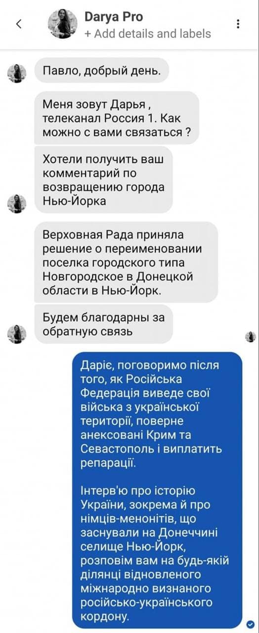 Відомо, що журналістка російського телеканалу написала Павлу Кириленко в соцмережах з проханням дати коментар щодо повернення колишньої назви селищу. Нагадаємо, що сьогодні, 1 липня, Верховна Рада перейменувала смт Новгородське в Бахмутському районі Донецької області в Нью-Йорк.