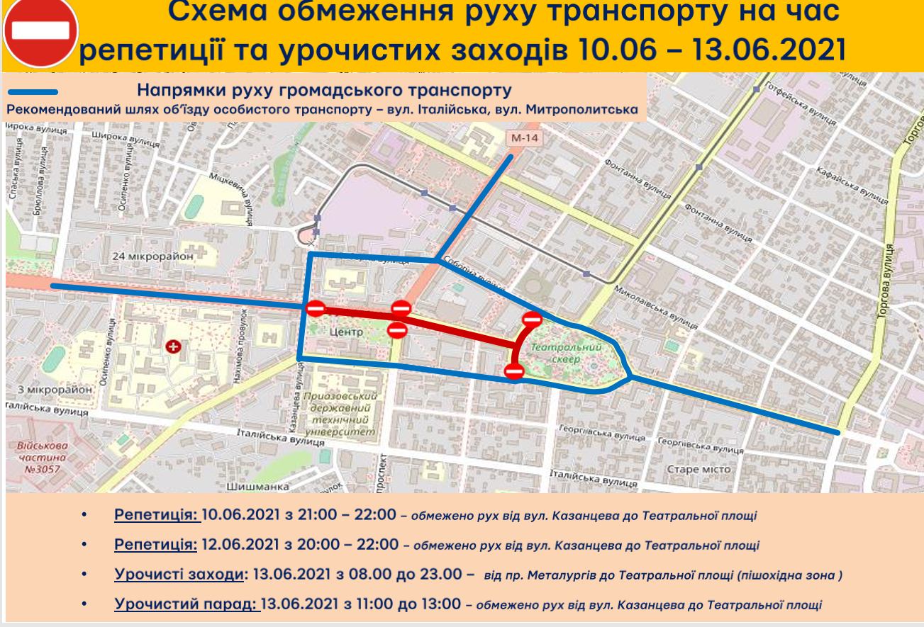 13 червня - з 8:00 до 23:00 - перекриють проїзд по пр. Миру від пр. Металургів до Театральної площі. Рух пасажирського транспорту організують за об'їзними маршрутами - по вул. Казанцева, вул. Університетській, вул. Соборній.