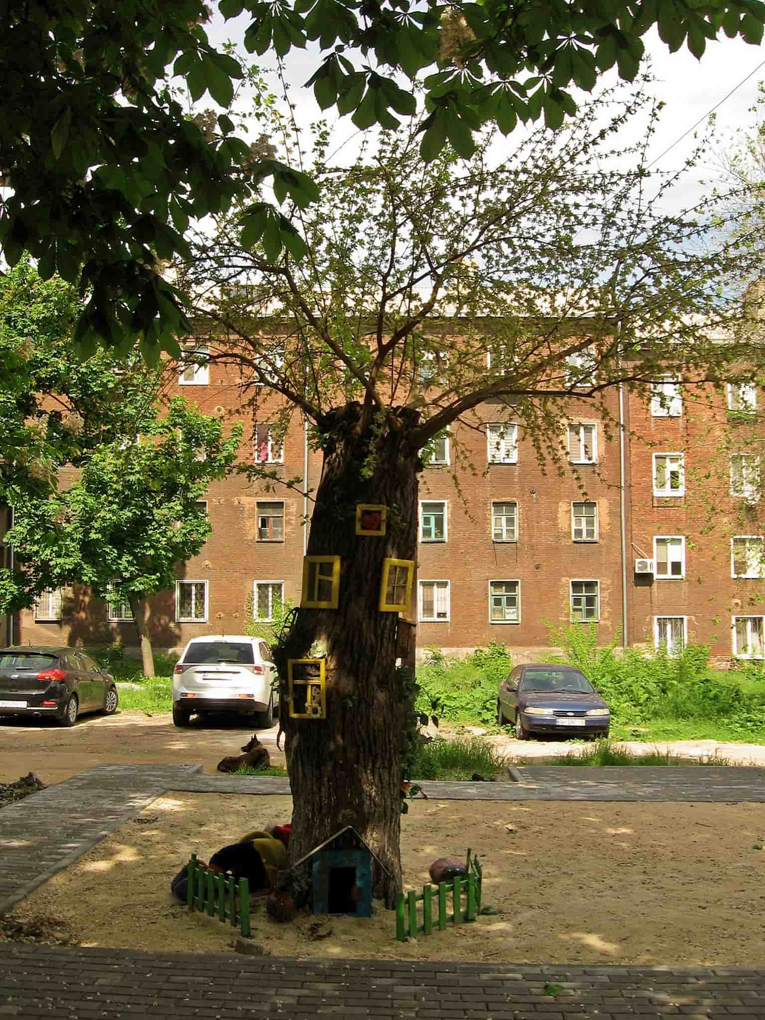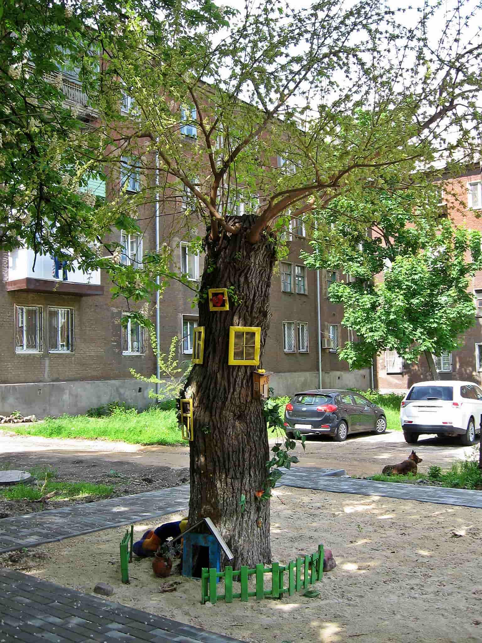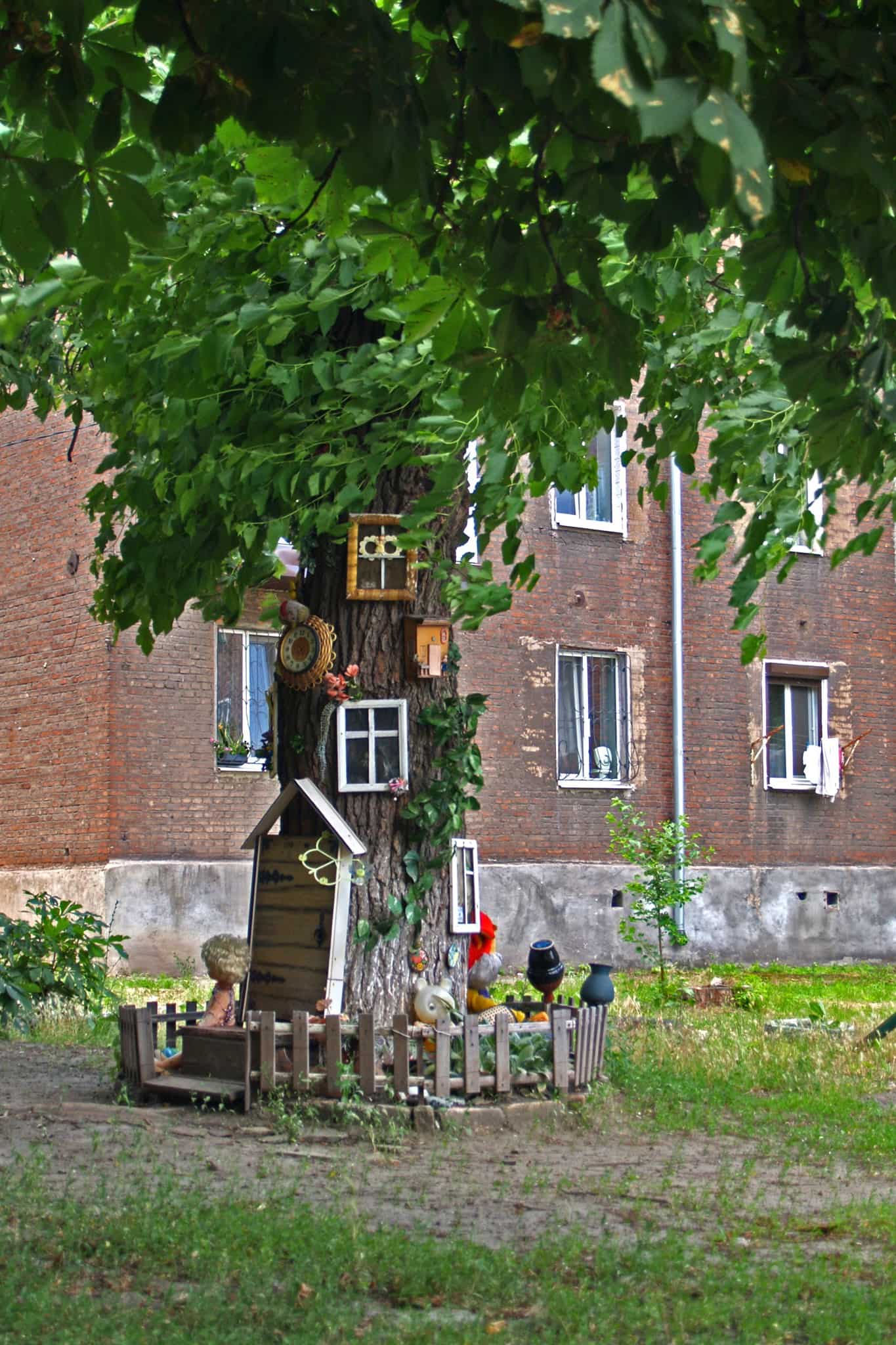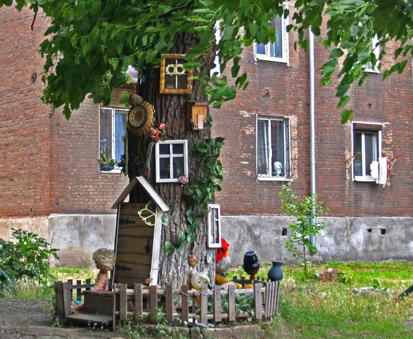 У коментарях городяни також доповнили колекцію світлин «окошкових» дерев. Кожен з об'єктів, очевидно, символізує багатоповерховий будинок - біля коріння споруджені символічні двері, є огорожа, а саме «подвір’я» населене іграшками.