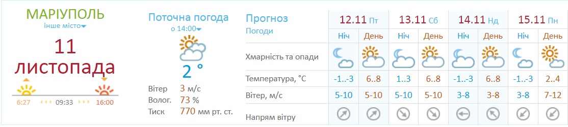 А ось наступний тиждень стартує холоднішими днями — у понеділок, 15 листопада, окрім нічних -1...-3°C у Маріуполі похолодає і вдень — лише 2-4 тепла за вікном. Доведеться кутатися в теплі куртки і, можливо, настав час діставати рукавиці. Слабкий північно-східний вітер з 3-8 м/с вдень зміниться на південно-східний, що посилиться до 7-12 м/с. Опадів також не очікується.