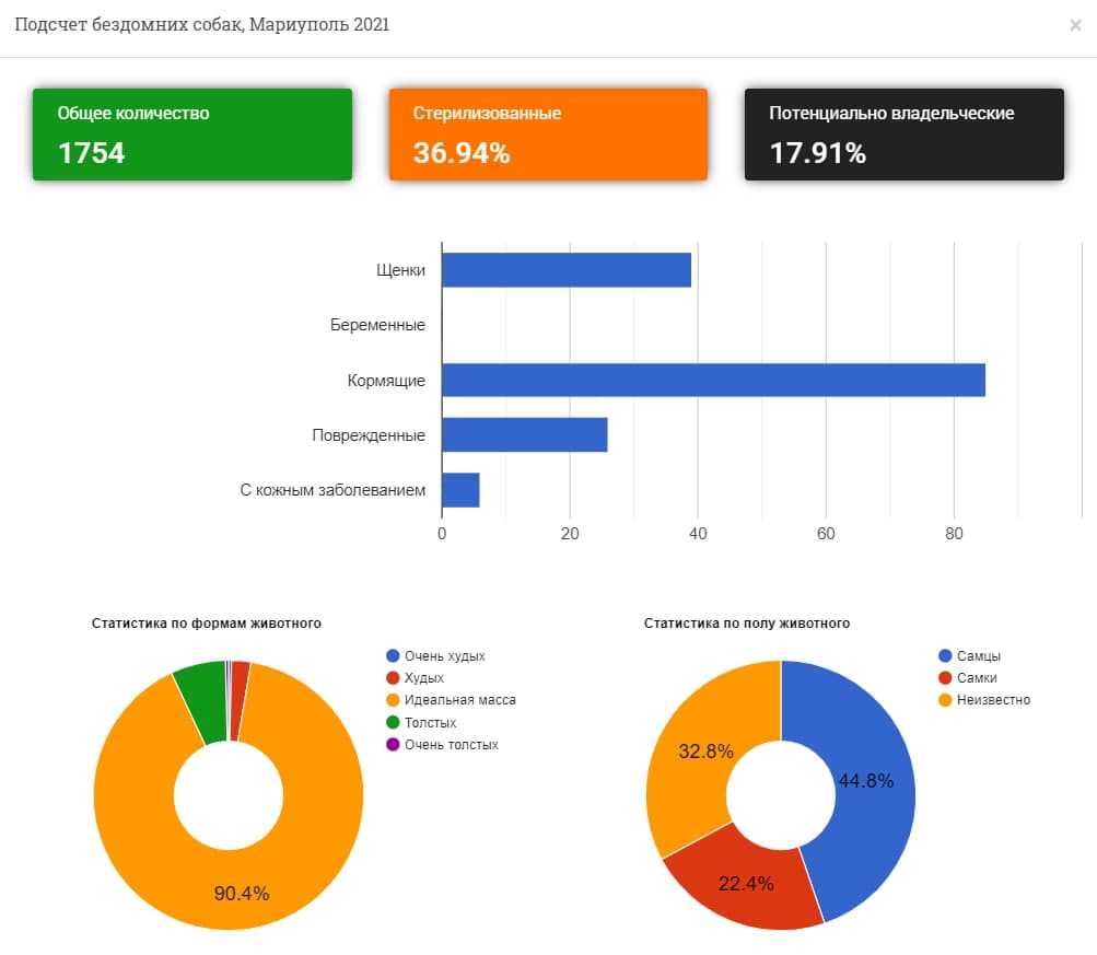 За результатами було визначено, що наразі в Маріуполі налічується 1 754 бездомних собаки, майже всі в ідеальній масі, і третина (36,94%) з них - стерилізовані. Також, з усіх тварин половина (44,8%) - самці і 22,4% - самки, у 32,8% - не вдалося визначити стать.