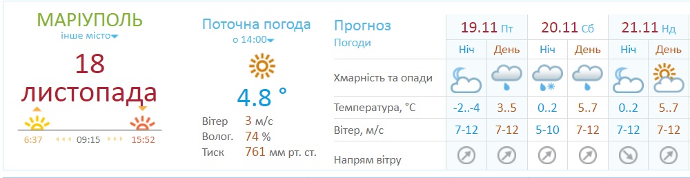 Так, за прогнозом Маріупольської гідрометеообсерваторії, п'ятниця в нашому південному місті видасться ще з уже звичною морозною ніччю та незначними "плюсами" у світлий час доби: -1…-3 °С та +2…+4 °С відповідно. Північно-західний вітер з 6-11 м/с надасть свіжості на відкритому повітрі, будуть ті ж мінлива хмарність і періодичне сонце. Проте істотних опадів на 19 листопада у Маріуполі не прогнозують. Водночас на території області можливий туман з видимістю 200-500 м.