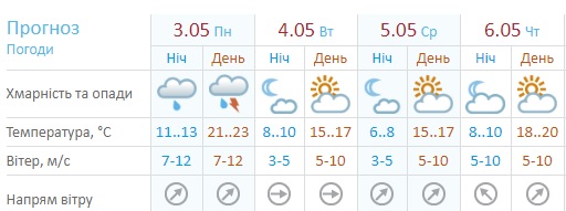Ніч з понеділка на вівторок виявиться не такою теплою, як попередній день. Запеклі +23 на термометрах спадуть до +8 ... + 10 градусів і земля охолоне після дощу. Вночі, 4 травня буде хмарно, а вдень з-за хмар вигляне сонце і знову підніме настрій відпочиваючим. За вікном буде +15 ...+ 17 тепла, але свіжо в порівнянні з жарким Першотравнем. Нічний легкий західний вітер з 5 м/с посилиться до 10 м/с і підбадьорить людей, що відправились на природу.
