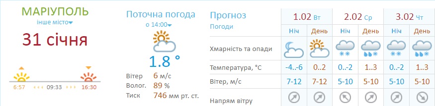 За повідомленням Укргідрометцентру, 1 лютого у Маріуполі буде тепло та з проясненнями, але з ожеледицею на дорогах. Також по всій Україні оголошено перший рівень небезпеки - водіїв та пішоходів закликають бути обережними та враховувати складності у дорозі.