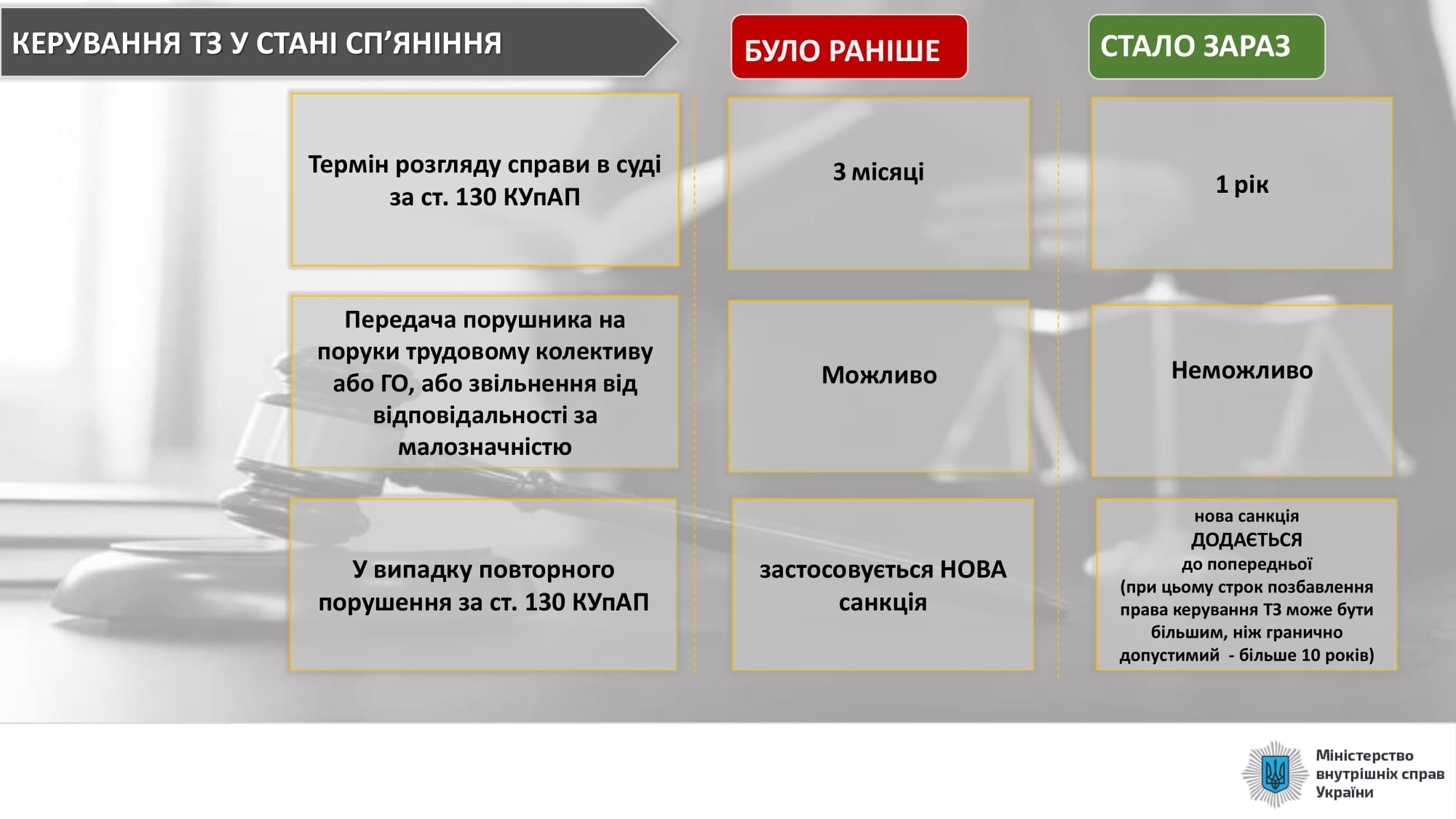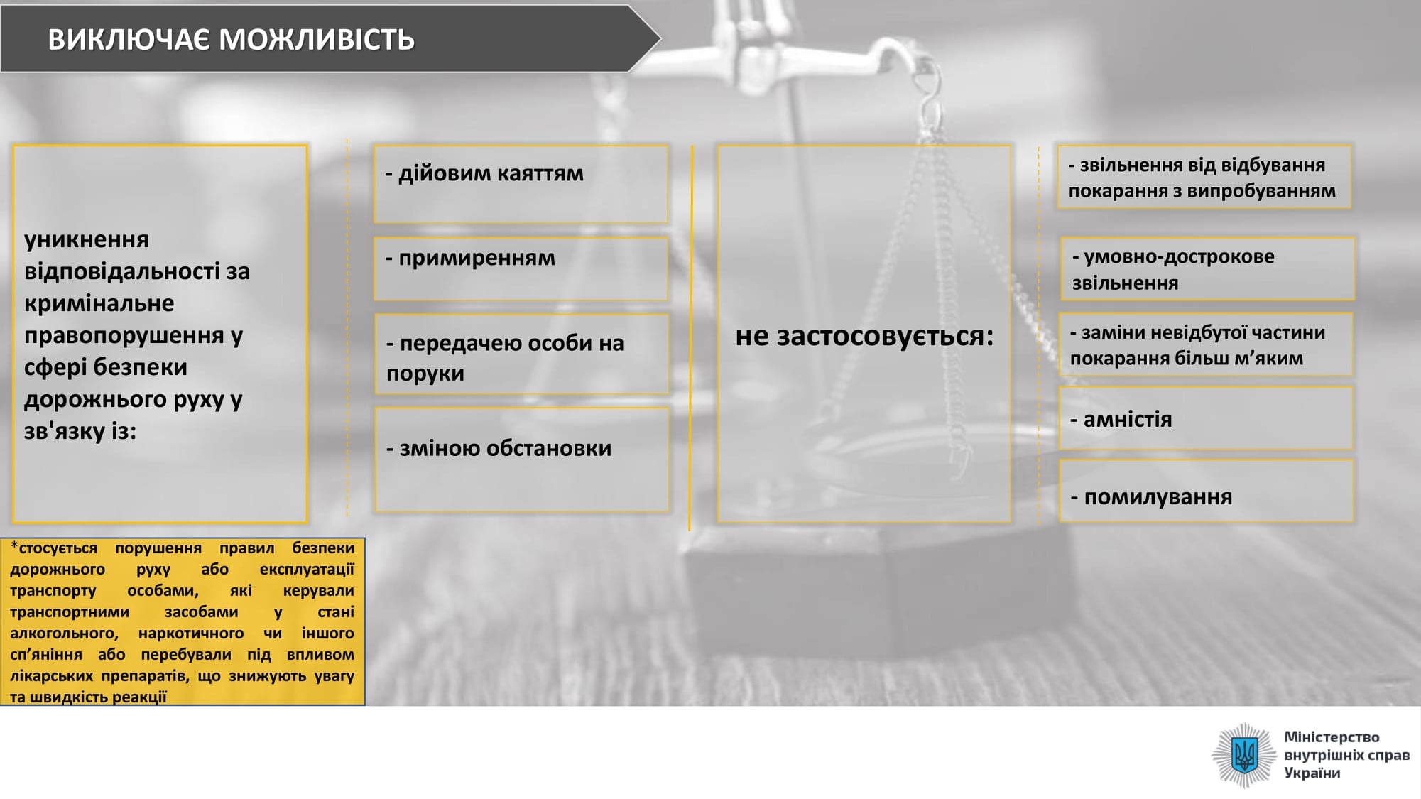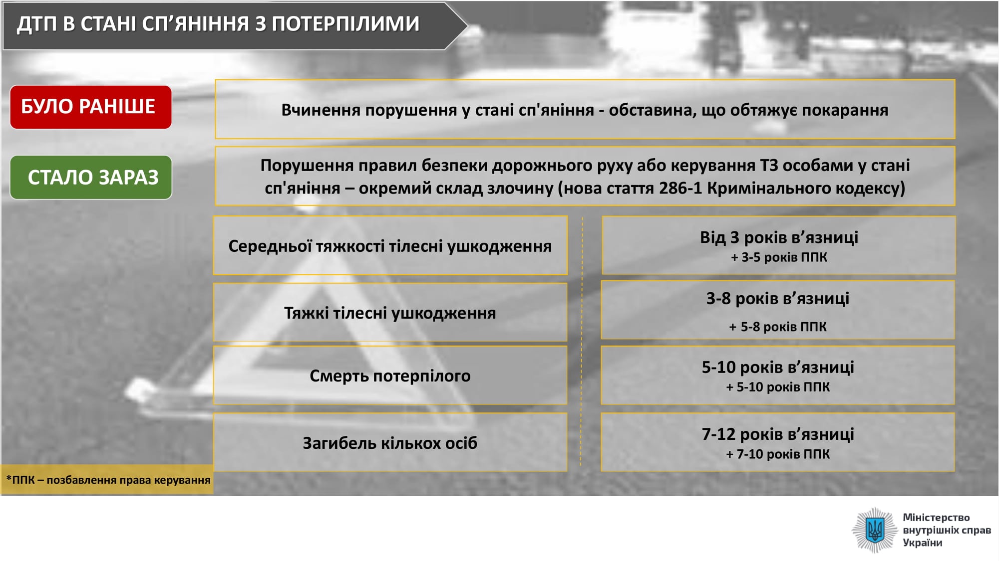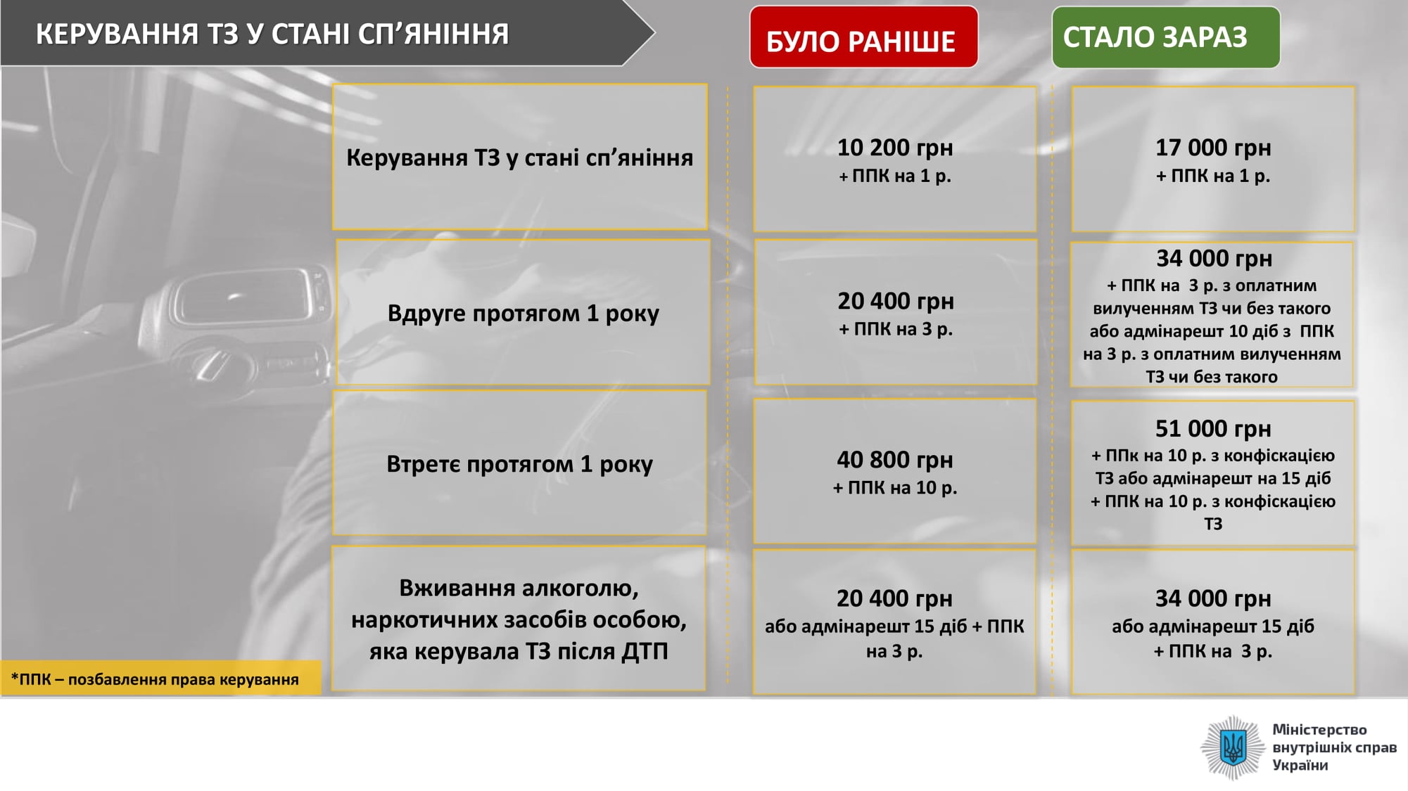 Якщо водій перебував у стані алкогольного сп'яніння, йому буде загрожувати штраф в розмірі 17 тис. грн з позбавленням водійських прав на рік. За повторне порушення протягом року - 34 тис. грн з позбавленням прав на три роки. Якщо водій порушить втретє - штраф 51 тис. грн, позбавлення прав на 10 років і конфіскація транспортного засобу.
