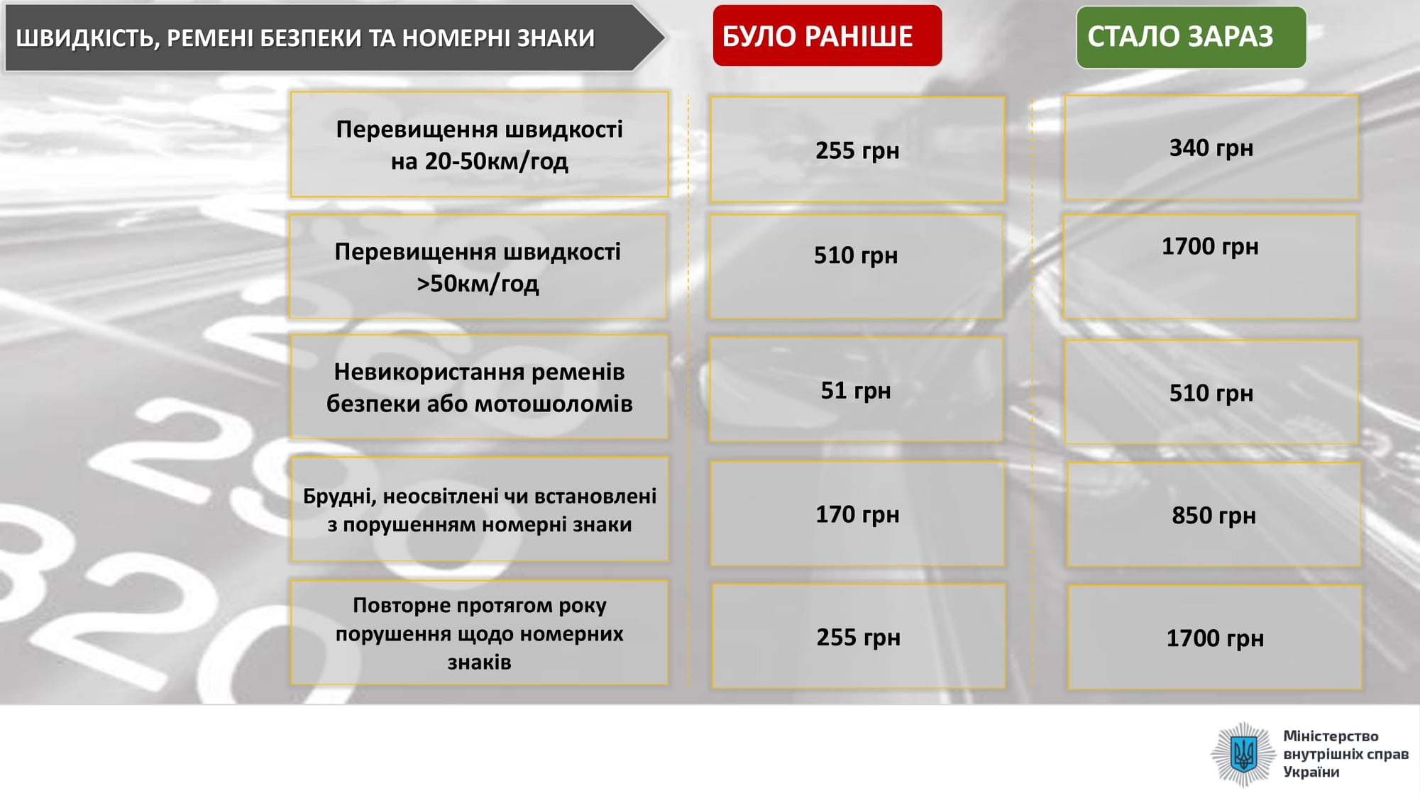 Як розповідав PR.UA, тепер мінімальний штраф за порушення правил дорожнього руху підвищується до 510 гривень . А саме - за непристебнутий ремінь безпеки, розмову телефоном без гарнітури, відсутність шолому у мотоцикліста, порушення правил проїзду перехрестя і ін. За втечу з місця ДТП штраф зросте з 255 до 3,4 тисячі гривень. Таке ж покарання буде за перевищення швидкості в населених пунктах більш ніж на 50 км/год.