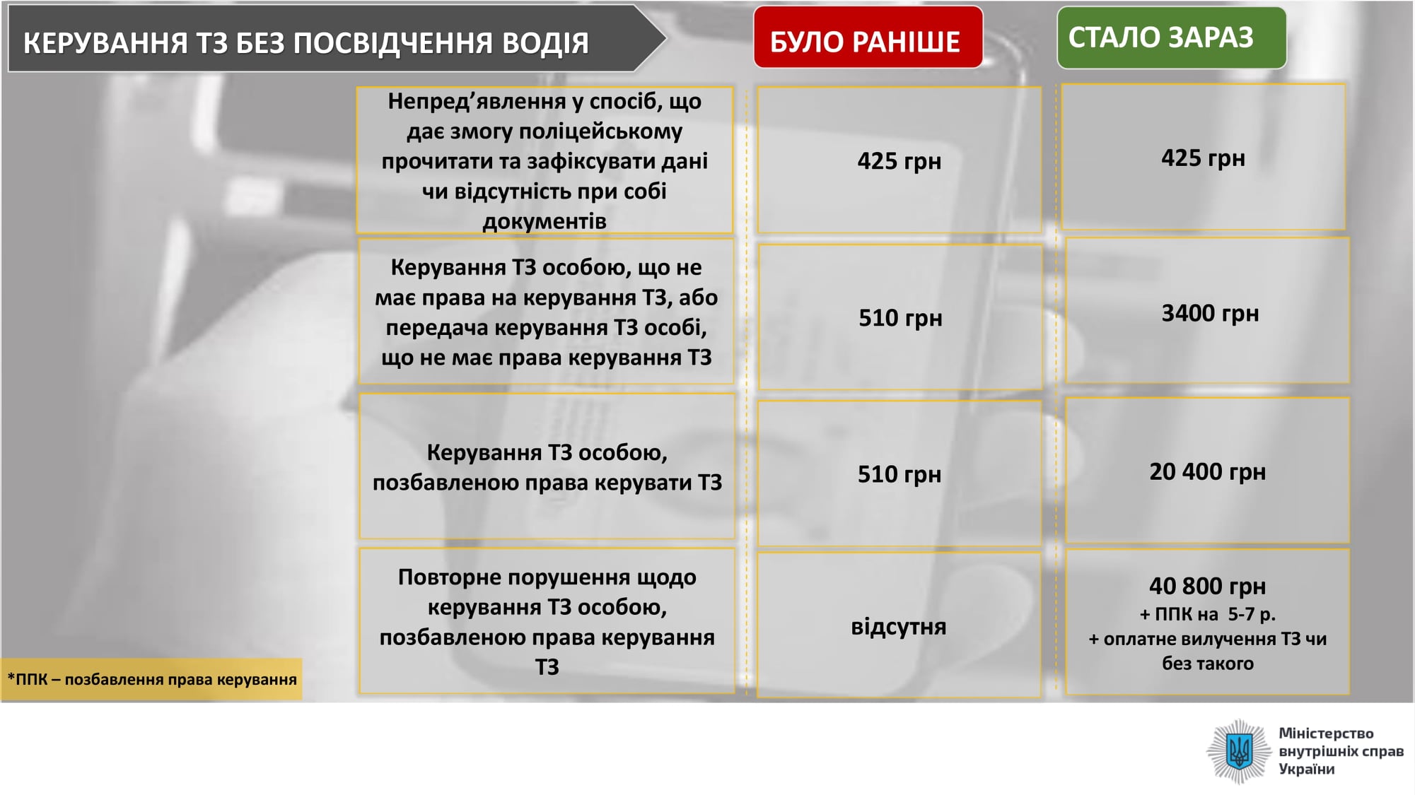 Їзду без прав каратимуть штрафом у 425 грн. Однак якщо у водія прав немає зовсім, йому доведеться заплатити 3,4 тисячі гривень. Раніше позбавлених прав водіїв будуть штрафувати на 20,4 тисячі гривень.