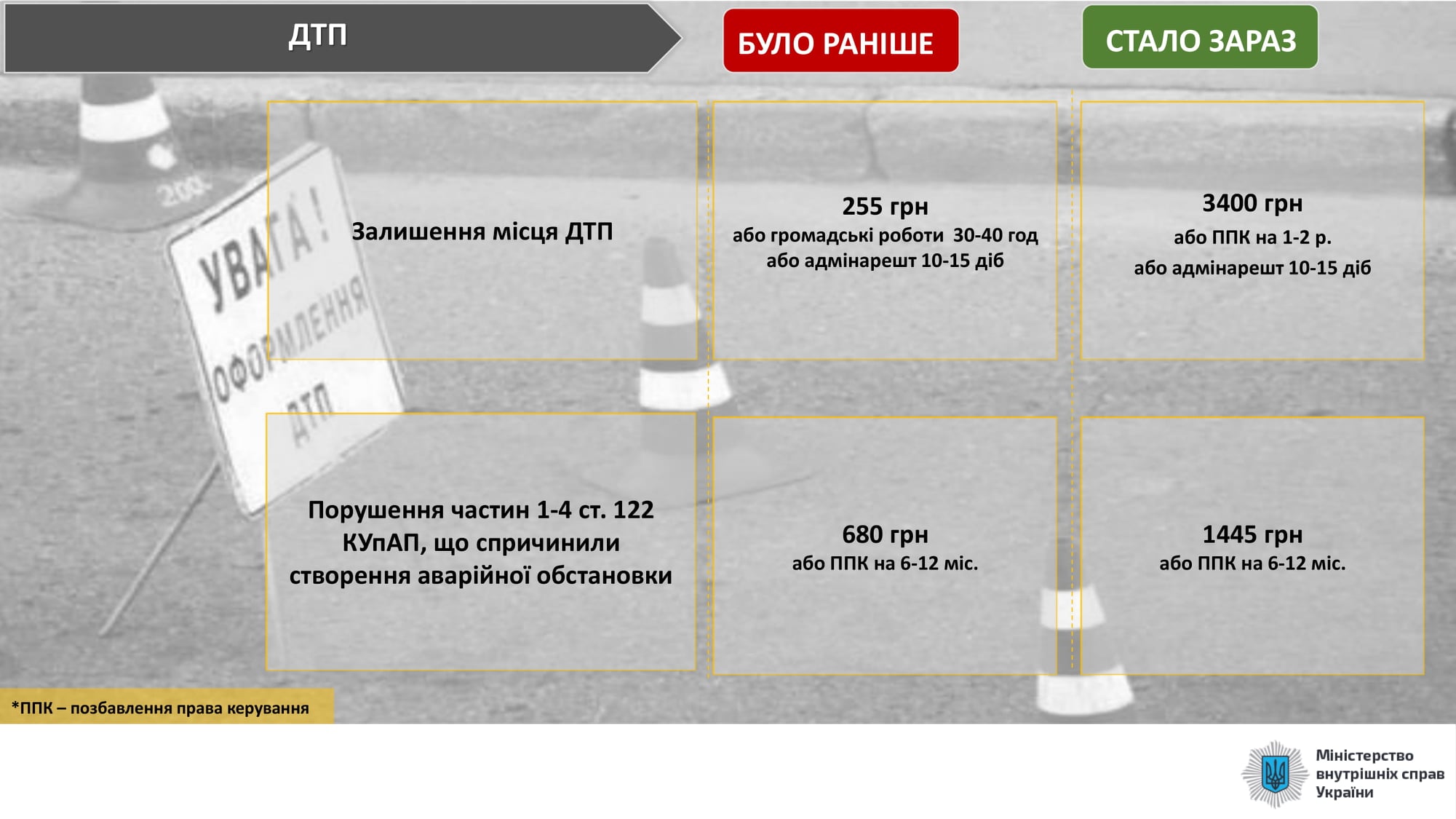 За ненадання переваги в русі авто швидкої, поліції або аварійній службі штраф підвищать з 510 до 680 грн. Створення аварійної ситуації каратимуть штрафом в 1 445 грн, а за порушення, яке призвело до ДТП - 850 грн.