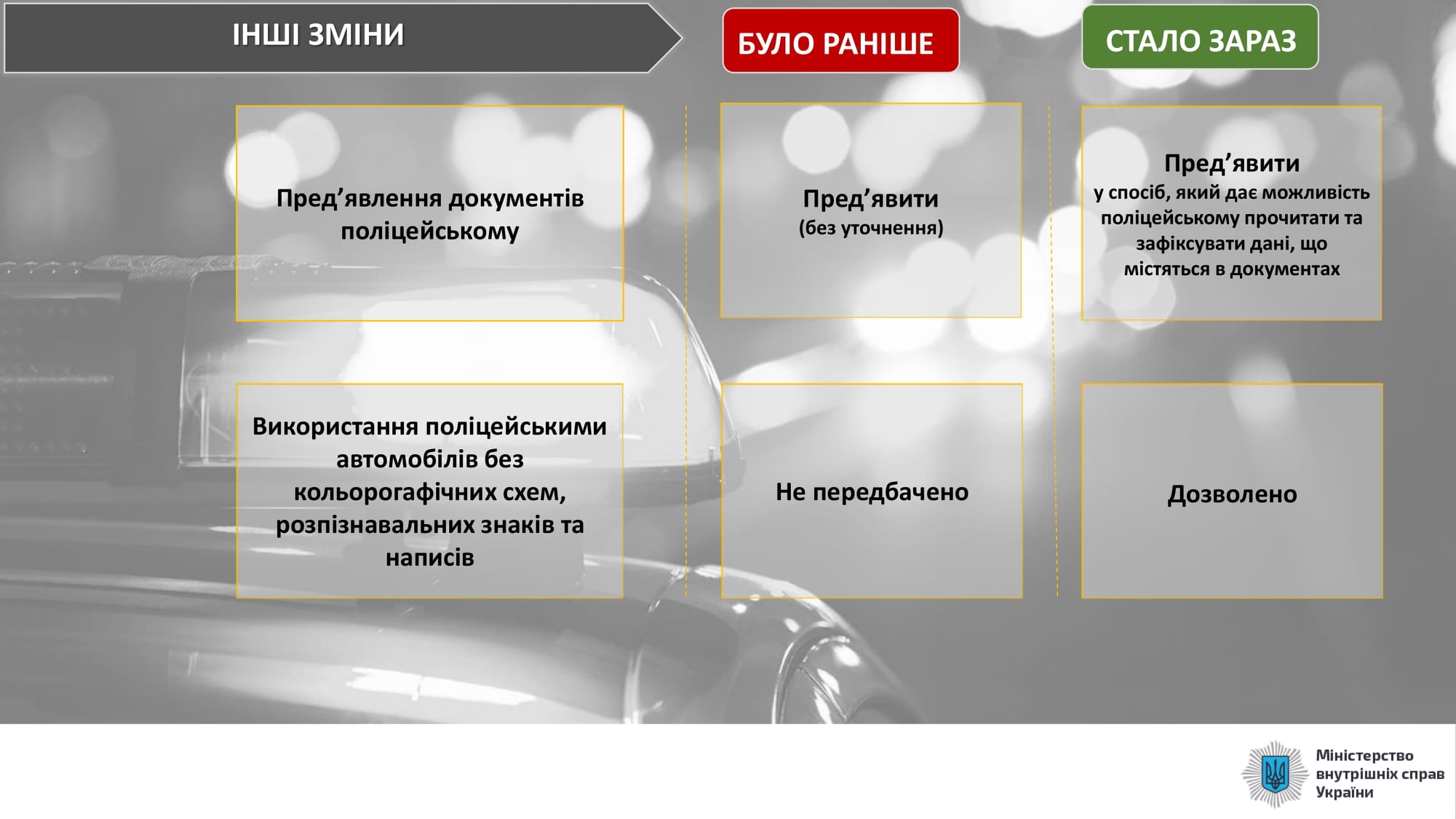 Також законом передбачається можливість зупинення транспортного засобу поліцейським для огляду водіїв з використанням спецзасобів для перевірки на стан сп'яніння або щодо вживання лікарських препаратів, що знижують увагу та швидкість реакції.