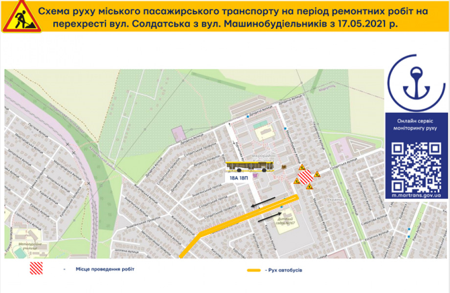 Так, починаючи з сьогоднішнього дня, 17 травня, і до 4 червня муніципальні автобуси № 18 (ДЮЇ - ЖМР «Курчатова») і № 18П (сел. Піщане - ЖМР «Курчатова») працюватимуть без заїзду на вул. Курчатова - вул. Дундича - вул. Машинобудівників.