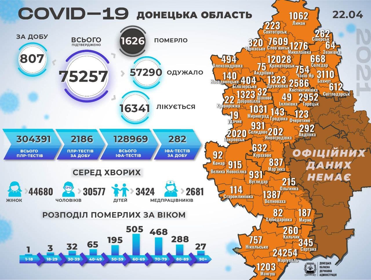 Так, 187 хворих на коронавірус за добу виявили в Маріупольській ТГ; 120 у Краматорській ТГ; 97 у Слов’янській ТГ; 53 у Костянтинівській ТГ; 50 у Волноваській ТГ; 42 у Покровській ТГ; 39 у Торецькій ТГ; 36 у Добропільській ТГ; 33 у Дружківській ТГ; 23 в Авдіївській ТГ; 21 у Лиманській ТГ; 16 у Великоновосілківській ТГ; 15 у Селидівській ТГ; 13 у Нікольській ТГ; 12 у Новогродівській ТГ; 11 у Курахівській ТГ; по 10 у Мангушській і Мар’їнській ТГ; 9 у Вугледарській ТГ; 7 у Мирноградській ТГ; 3 у Бахмутській ТГ.