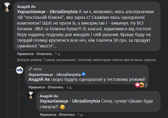 Так, під публікацією один з користувачів запитав, чи є альтернативні варіанти нинішній постільній білизні у поїздах.