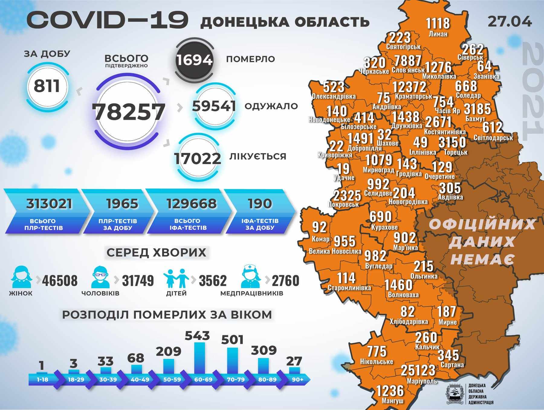 Так, 303 хворих на коронавірус за добу виявили в Маріупольській ТГ; 95 у Покровській ТГ; 90 у Слов’янській ТГ; 83 у Краматорській ТГ; 74 у Торецькій ТГ; 30 у Добропільській ТГ; 23 у Дружківській ТГ; 19 у Костянтинівській ТГ; 17 у Мар’їнській ТГ; 16 у Селидівській ТГ; 15 у Вугледарській ТГ; 14 у Курахівській ТГ; 10 у Білозерській ТГ; 7 у Лиманській ТГ; по 4 у Мангушській, Великоновосілківській та Олександрівській ТГ; 2 у Бахмутській ТГ; 1 у Волноваській ТГ.