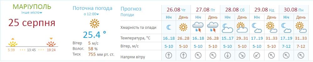 З суботи, 28 серпня, розпочнеться підвищення температури та повернеться спека. Так, після дощу ніч на християнське свято Успіння Богородиці очікується ще більше свіжою - з +15...+17 °C, а вдень стовпчики термометра досягнуть позначки +31 градус. У цей день маріупольці також відчують подих північного, а потім північно-західного вітру при швидкості 5-10 м/с.