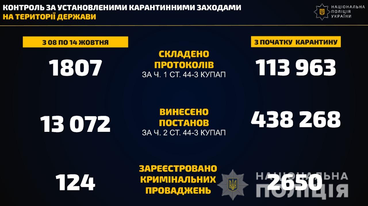 Усього з початку введення карантинних обмежень складено 113 963 адміністративних протоколів проти фізичних осіб та винесено 438 268 постанов проти власників і керівників підприємств, установ та організацій, які відмовляються дотримуватися карантинних норм.