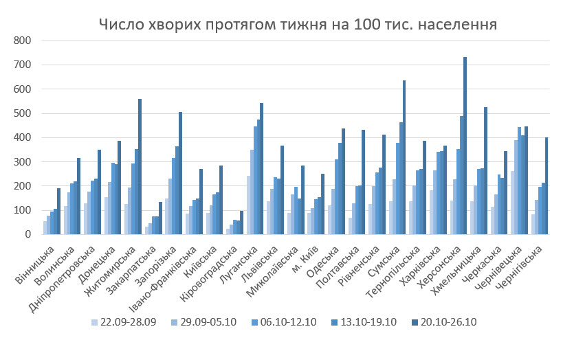 За числом хворих протягом тижня на 100 тис. населення лідерами антирейтингу стали Херсонська, Сумська, Житомирська, Луганська та Запорізька області. Щодо Донеччини, то цей показник за 20-26 жовтня складає майже 400 осіб на 100 тис. населення, а за 13-19 жовтня - майже 300 осіб на 100 тис. населення.