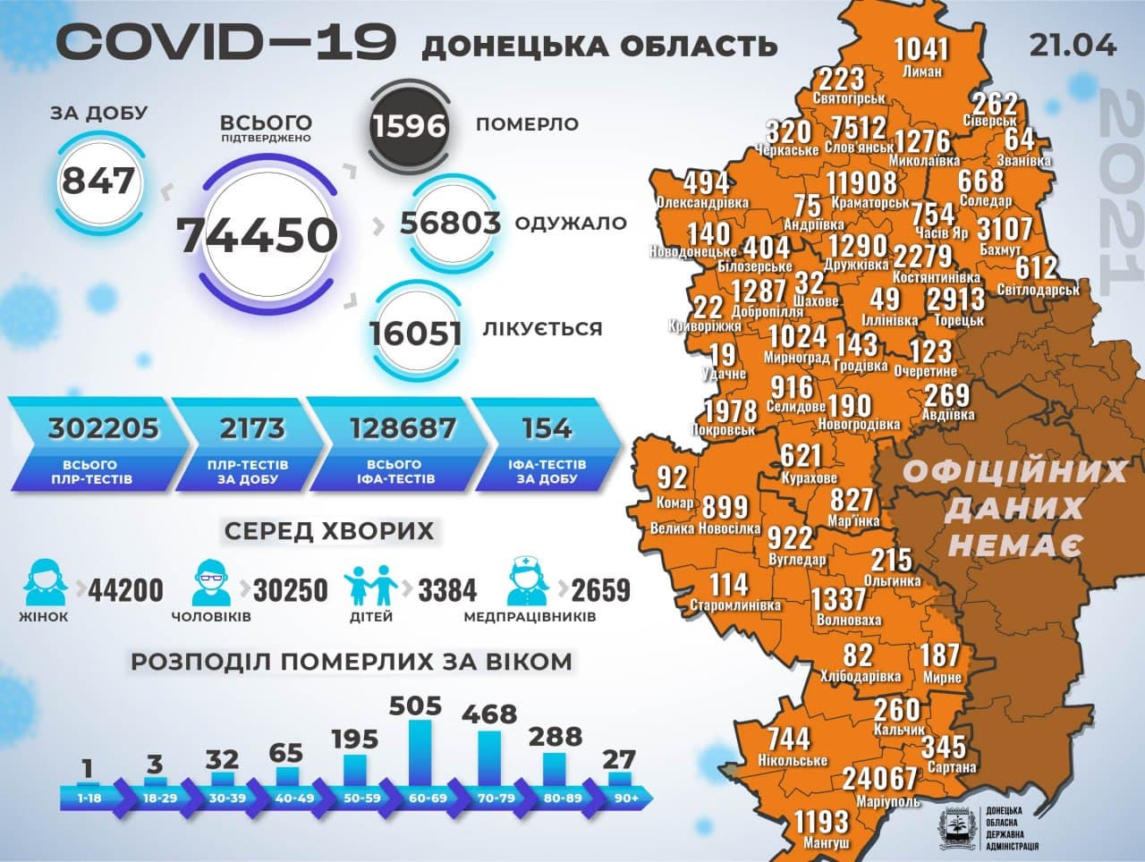 На Донеччині за середу, 21 квітня, лабораторії підтвердили коронавірус ще у 847 осіб, серед яких 20 дітей, повідомив голова ДонОДА Павло Кириленко.