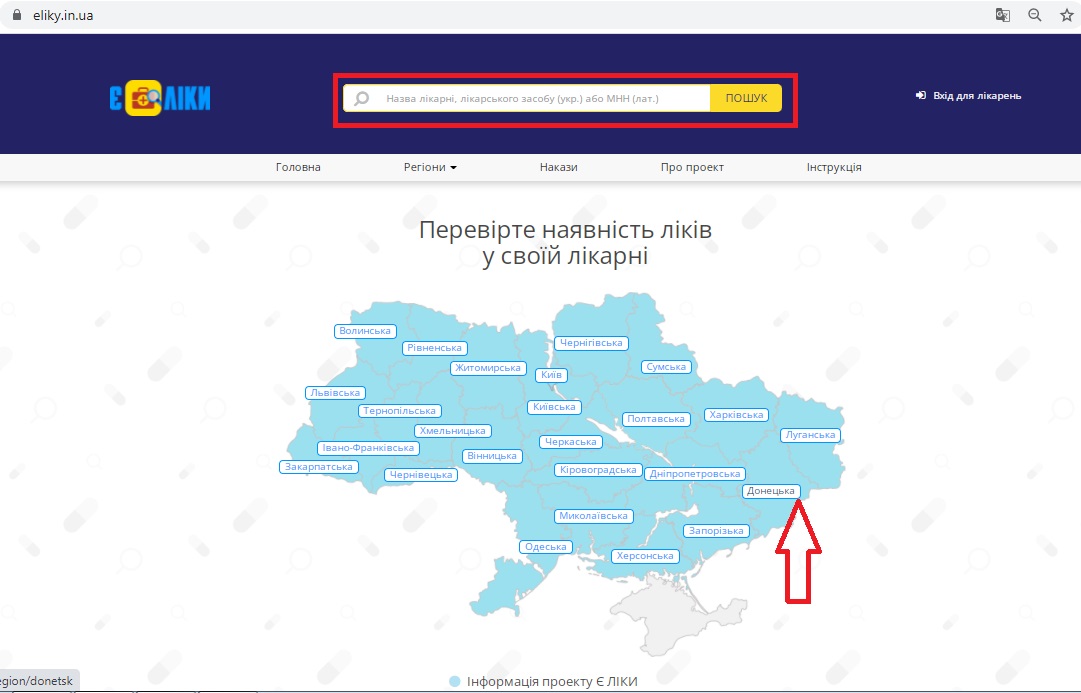1. На головній сторінці сайту «Є ЛІКИ» обираємо Донецьку область на інтерактивній мапі. Або можна скористатися полем пошуку: ввести назву потрібного препарату чи медичного закладу.