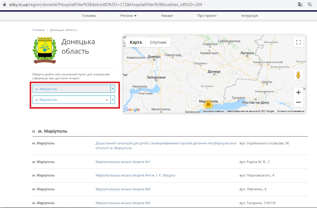 2. Відкривається мапа Донеччини та список медзакладів, підключених до системи. Для зручності вводимо у полях зліва «Маріуполь» та отримуємо список місцевих лікарень.