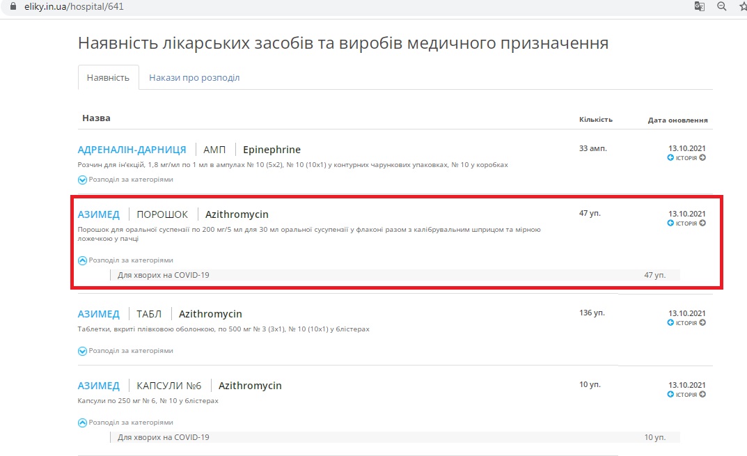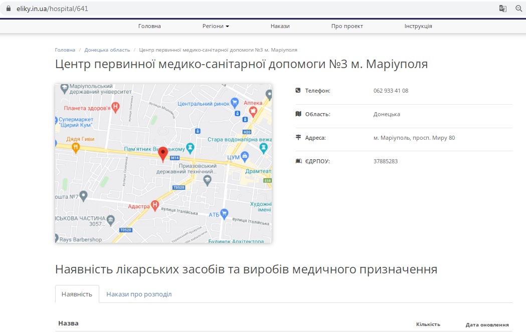 4. Відкривається сторінка лікарні з контактними даними та списком наявних препаратів і виробів медичного призначення. Тут доступна інформація про кількість та особливості розподілу товарів (наприклад, для загального використання, для «ковідних» хворих та інше).