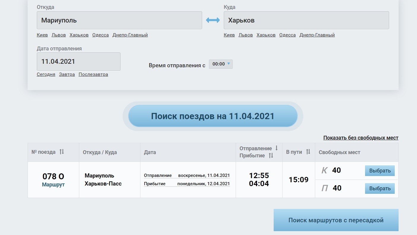 З Харкова пасажирський потяг виїжджатиме о 16:23, до Маріуполя прибуде о 06: 30. У зворотному напрямку зі столиці Приазов'я поїзд відправляється о 12: 55. До Харкова пасажири приїдуть о 03: 59. Загальний час поїздки - 14 годин 7 хвилин.