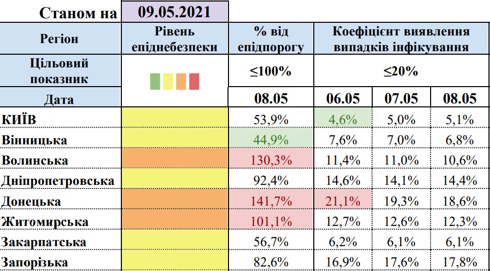 Решта регіонів знаходяться в "помаранчевій" зоні – це Волинська область, Донецька, Житомирська, Кіровоградська, Луганська, Тернопільська та Черкаська, всього 7 областей.
