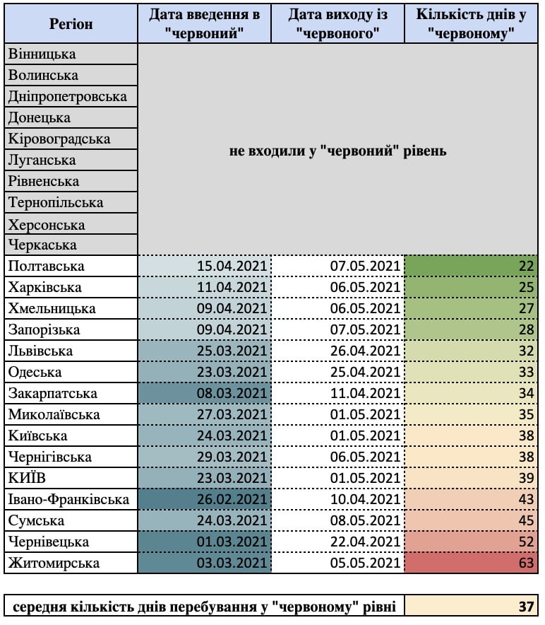 Також були опубліковані дані по кількості днів, проведених в "червоній" зоні кожною областю. Найбільше в найжорсткіших карантинних умовах провела Житомирська область - 63 днi.