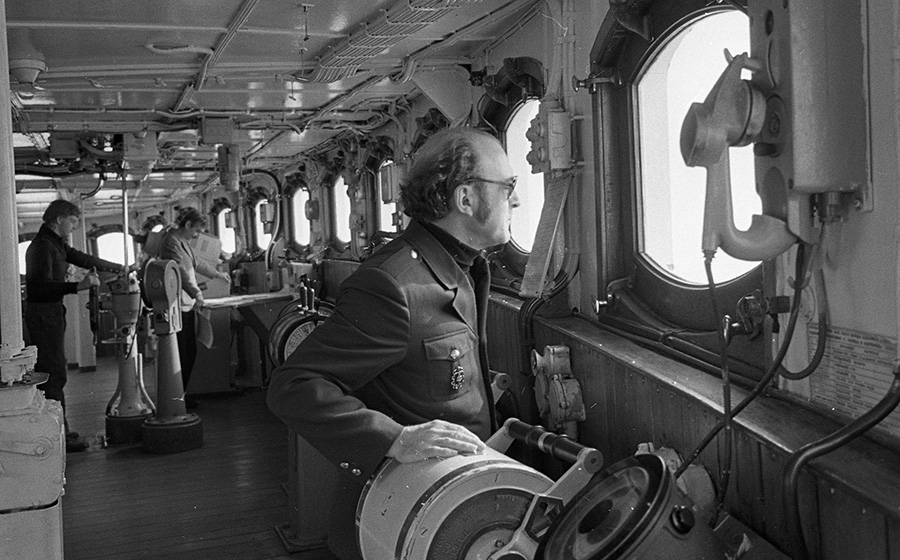 На світлині Бориса Дембицького: Жартам завжди місце. Журналіст Віктор Гринько в рубці криголама слухає байки бувалих моряків і ділиться своїми враженнями