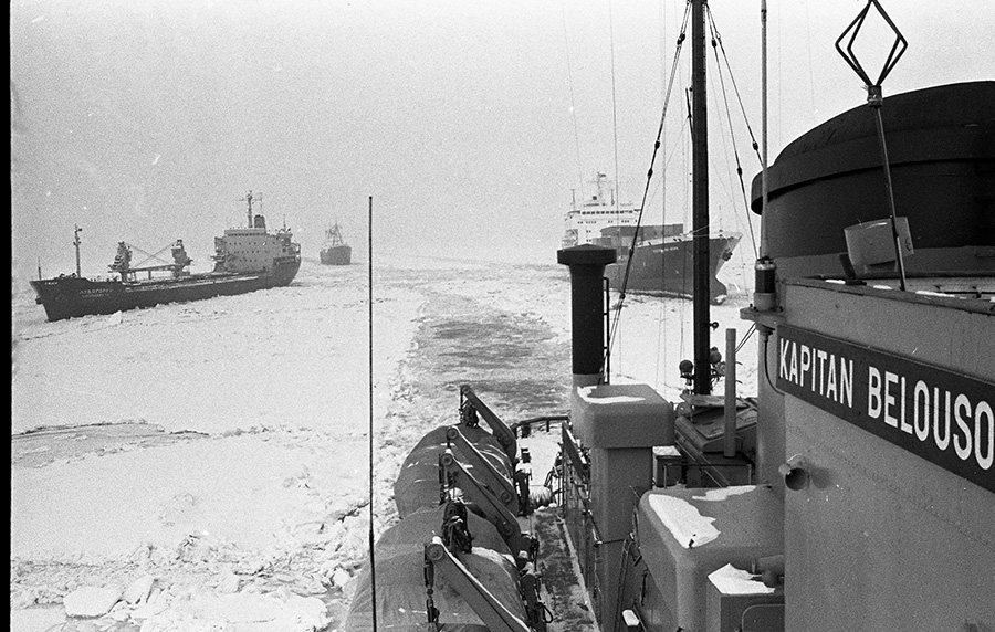 На світлині Бориса Дембицького: Караван. Шикуючись за криголамом, судна «бредуть» до вільної води крізь льоди та тороси.