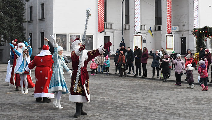Організатори не збирали глядачів через карантин, однак понад 100 дітей і дорослих не змогли пройти повз новорічного свята. Команди Дідів Морозів, Снігуроньок та інших персонажів розважали городян піснями, танцями і конкурсами.
