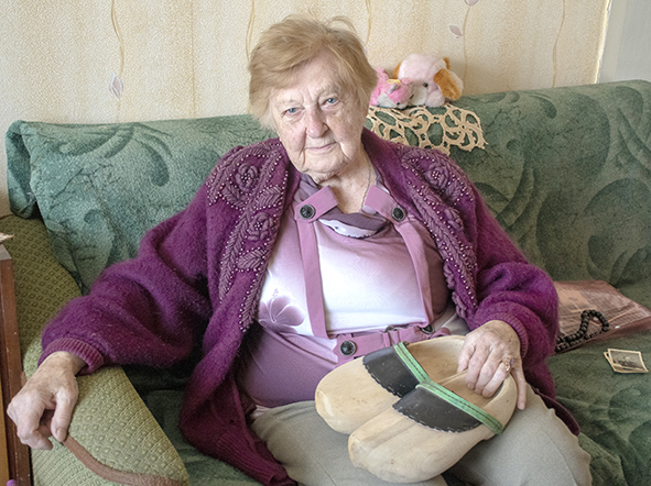 Світлина Альбіни Баркової. Пам'ятний подарунок. У 1995 році на замовлення Алли Бієнко в Німеччині були зроблені дерев'яні черевики зі шкіряним ремінцем, які досі нагадують їй про страшні події молодості.